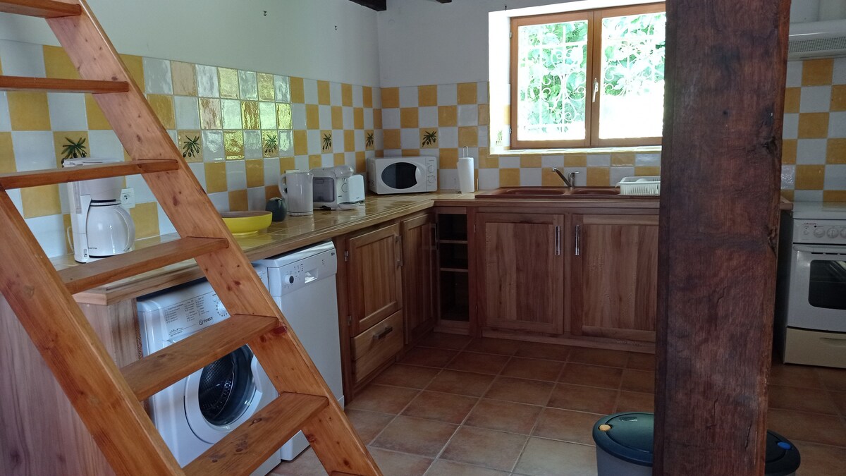 Šarmantna mala kuća od 65 m2 (bez spoljnog prostora) u srcu sela, u blizini svih sadržaja (prodavnica, pekara, apoteka, restoran,...) i idealno smještena na putu za Sent Žak de Kompostelle Sami, kao par, sa porodicom ili prijateljima (do 6 kreveta), dođite i otkrijte naš prelijepi region i boravite u našoj nedavno renoviranoj i uređenoj kući u boemskom stilu. Dnevni boravak/trpezarija s opremljenom kuhinjom 1 velika spavaća soba, 1 mezanin s pristupom mlinarskim merdevinama