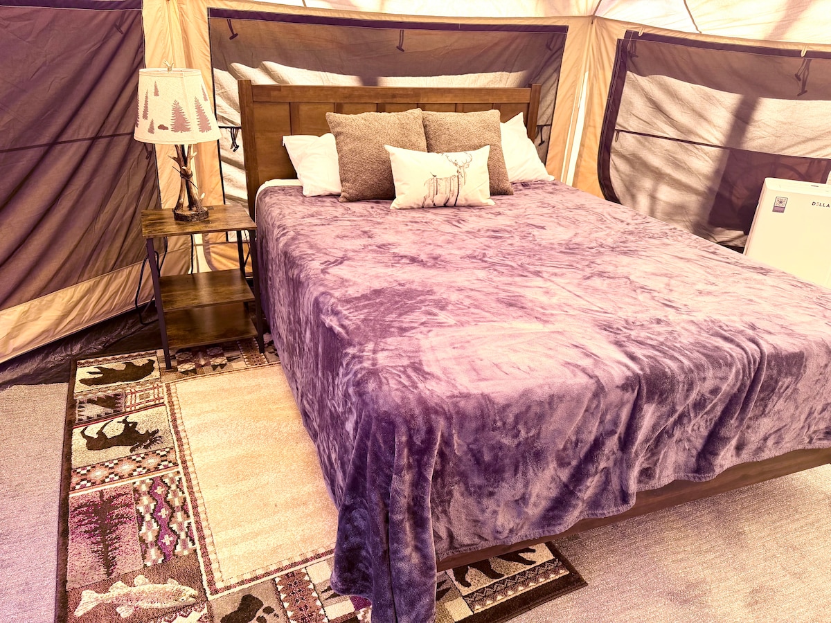 GRIJANI ŠATORI! Nagrađivani GlampKnox, gdje se kampovanje susreće s luksuzom! U našem elegantnom šatoru Grande može udobno da spava 6 osoba. *3 udobna bračna kreveta (1,6x2) *Peškiri za tuširanje *Ventilatori *Posteljina *JACKERY Power *Ognjište *Fenjer * Mreža za bube Vanjski tuš sa TOPLOM/hladnom vodom, privatni toaleti sa mikrotalasnom pećnicom, dostupan je led. Opustite se i kuvajte pored ognjišta ispod našeg natkrivenog trijema sa stolicama za ljuljanje i pogledom na planine Kamberland. IG: @GlampKnox *Slobodno pogledajte naše druge šatore! *Zima: ponesite propan za grejalice i dodatne ćebad