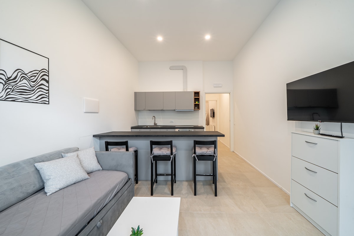 Udoban studio apartman s odvojenom spavaćom sobom i modernim i dobro održavanim namještajem, u srcu istorijskog centra Trenta. Prozori, kuhinja i kupatilo su nedavno renovirani. Udaljen 7 minuta hoda od željezničke stanice i 3 minuta od dvorca Buonkonsiljo, u jednoj od najkarakterističnijih ulica grada. 15% popusta od 7 dana i 20% od 28 dana. Od januara 2021. godine boravišna taksa iznosi 1,00 EUR po noćenju za odraslu osobu (najviše 10 noćenja) i plaća se u objektu.
