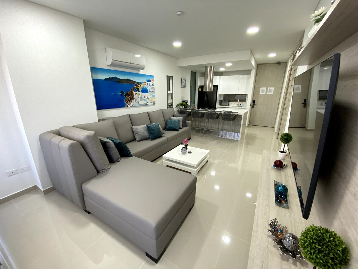 UŽIVAJTE U ODMORU. 10 minuta od aerodroma i 10 minuta od centra Santa Marte, predivne klime u kojoj se kombinuju vjetrovi Sijera i Karipskog mora. Direktan pristup plaži, bazeni, TERETANA, vlažni prostor, zajednički rad, čitaonice, TV sobe, žena, vrtić, restorani. Pogodno sa opremljenom kuhinjom, mašinom za pranje veša, mašinom za sušenje veša, dve spavaće sobe, velikom terasom, televizorom, televizorom, klima-uređajem i 3 velika kupatila. Jedan bračni krevet, jedan bračni krevet, 2 kreveta za jednu osobu, bračni krevet i kauč na razvlačenje