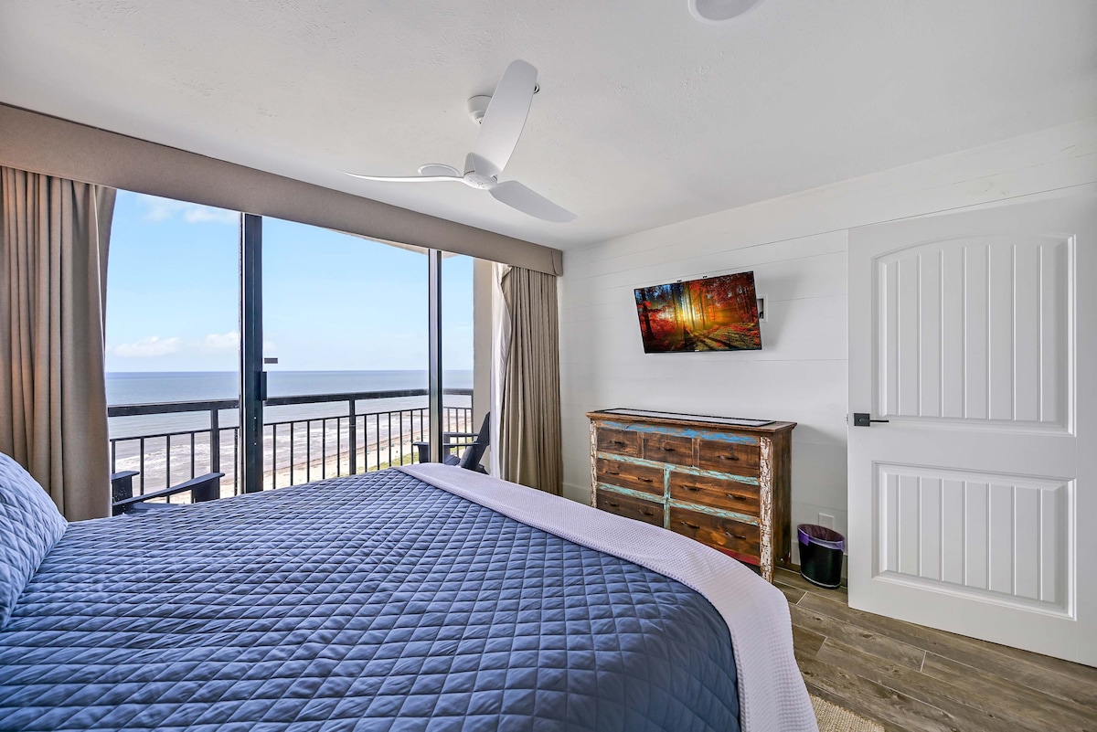 Bazen će biti zatvoren do 13. marta 2026. godine Kondominijum uz okean sa zadivljujućim pogledom Uživajte u boravku u našem prostranom kondominiju sa 2 spavaće sobe i 2 kupatila u Galvestonu. Uživajte u pogledu na okean sa balkona, dnevnog boravka i primarne spavaće sobe dok uživate u sadržajima. Tu su bazen, hidromasažna kada, teniski teren/teren za pikbol i prostor za roštilj. 🌟Za 6 osoba 🌟Bračni krevet (180x200) 🌟bračni krevet (širine 150-179 cm) 🌟kauč na razvlačenje dušek 🌟na naduvavanje 🌟Potpuno opremljena kuhinja 🌟Privatni namješteni balkon 🌟Oprema za plažu je uključena – peškiri, kolica, stolice, hladnjak
