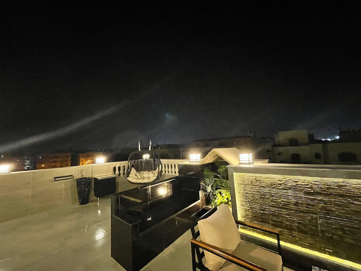 Vrhunski luksuzni penthaus u Kairu: panoramski pogledi i krov Dobro došli u luksuzno utočište bez premca na cijelom gornjem spratu u prestižnom području Šeraton Heliopolisa. Doživite panoramski pogled od 360 stepeni koji oduzima dah. Zakoračite u svoju privatnu oazu na krovu od 160 m2 s bujnom vještačkom travom, ogromnom sjenovitom pergolom s luksuznim sjedećom garniturom, dodatnim baštenskim namještajem i elegantnim mermernim šankom. Sofisticirana spoljna rasvjeta stvara čaroban ambijent. Direktan pristup pruža lift