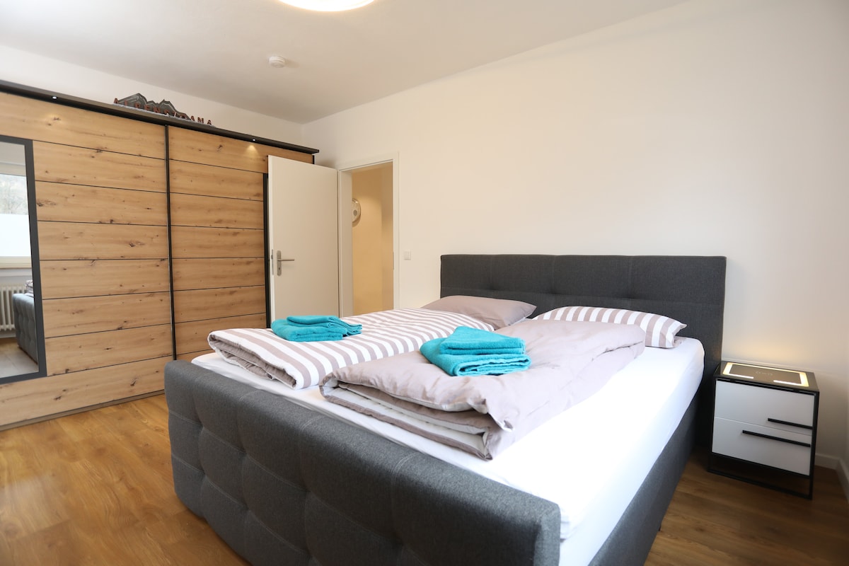 Jednostavan, ali lijep 2,5-sobni stan u prizemlju (oko 50 m² stambenog prostora). Gosti takođe mogu da koriste terasu i baštu. Stan se nalazi u neposrednoj blizini centra grada, peške je udaljen samo oko 3 minuta od železničke stanice i na 5 minuta do pešačke zone u Sifeldu. Tlocrt: Potpuno opremljena kuhinja 1 x dnevni boravak sa trpezarijom sa lepim orielom sa pogledom na baštu; 1x spavaća soba sa bračnim krevetom, velikim garderoberom, tuš-kabinom i pogledom na baštu; skladište za WC šolju
