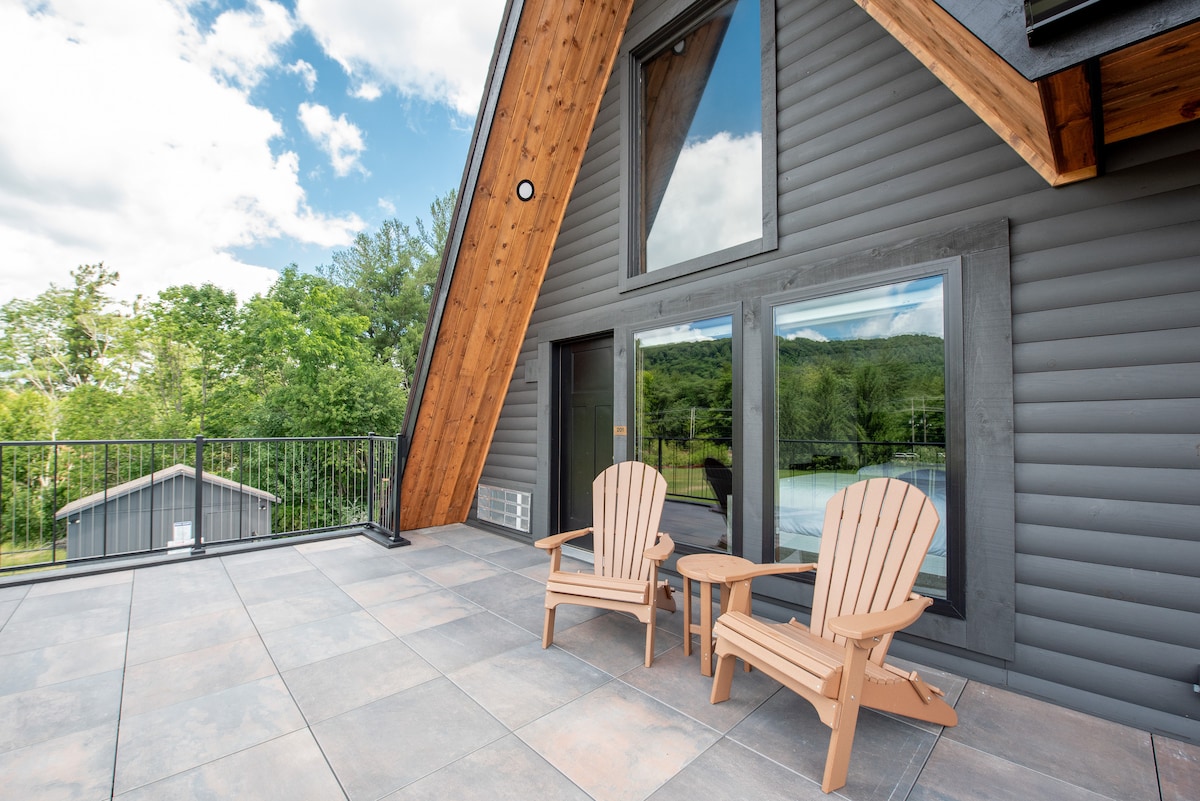 Escape to this spacious, log cabin-inspired retreat with soaring vaulted ceilings, two Queen beds, and a warm electric fireplace. The luxurious bathroom features a walk-in shower with quality bath products, and the kitchenette makes in-room dining easy. Stream your favorites on the Smart TV, then step onto the deck and take in sweeping views of the outdoor pool. Whether sipping morning coffee in the crisp mountain air or winding down at sunset, this is your perfect mountain getaway.