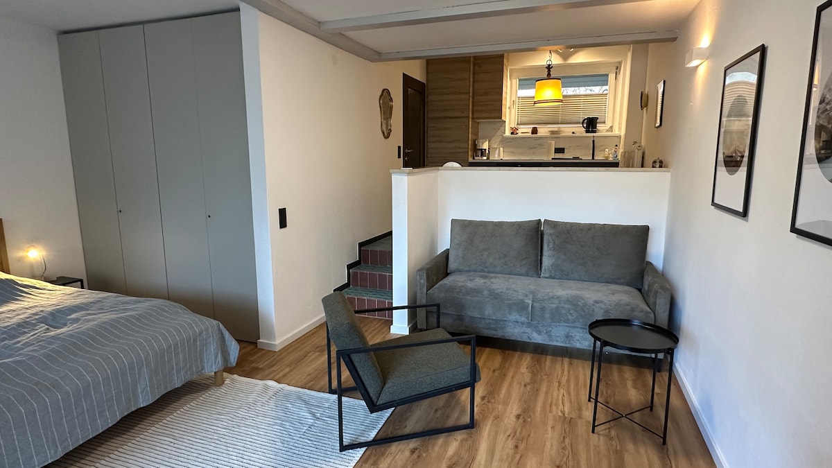 Udoban stan za najviše 4 osobe (savršen za 2 osobe). Prvi sprat, pristup liftom, 38m². Nalazi se u mirnom dijelu grada, na kratkoj pješačkoj udaljenosti od centra grada. Bračni krevet (1,40 x 200 cm), krevet na sprat, kauč na razvlačenje za najviše 2 osobe (može se produžiti) potpuno opremljena kuhinja kupatilo sa kadom/tušem, WC šolja velika garderoba WLAN, kablovska televizija, moguće je korišćenje usluga striminga sa sopstvenim nalogom na našem povezanom televizoru veliki balkon s prekrasnim pogledom na planine