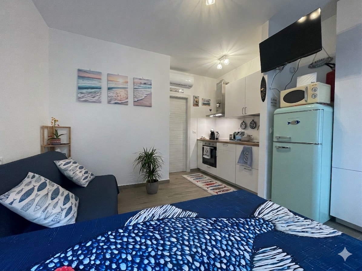 Doživite more iz ptičije perspektive! Moderan studio apartman na prvom spratu, udaljen samo 100 m od plaže, sa jedinstvenom pogodnošću ekskluzivne terase na gornjem spratu: vaš privatni kutak za opuštanje pod suncem. Renoviran je 2020. godine, a nudi Wi-Fi, klima-uređaj, TV i potpuno opremljenu kuhinju (sa rernom i mikrotalasnom pećnicom). Uključuje komplet posteljine i peškira. Bezbjednost je zagarantovana sigurnosnim vratima. Parking na ulici u blizini. Bonus: 2 bicikla za iznajmljivanje po rezervaciji da slobodno istražite obalu!