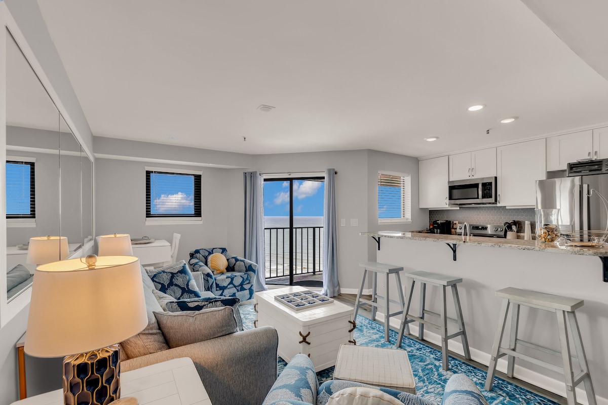 Welcome to JJ’s Penthouse At The Beach ~ Water’s Edge 1508! 1 bedroom, 2 bath! All the luxuries of home.. Living room ~ Queen size pull out sofa, 2 leather recliners, 42” electric fireplace, 65” smart TV, 84” ceiling fan! Fully equipped kitchen! Bedroom ~ King size bed, 55” smart TV, 72” ceiling fan! Let’s not overlook the FABULOUS balcony and view! It can’t be beat and having no one above you is the icing on the cake! We also offer units 1110, 1504, and 1509 - all fully renovated!