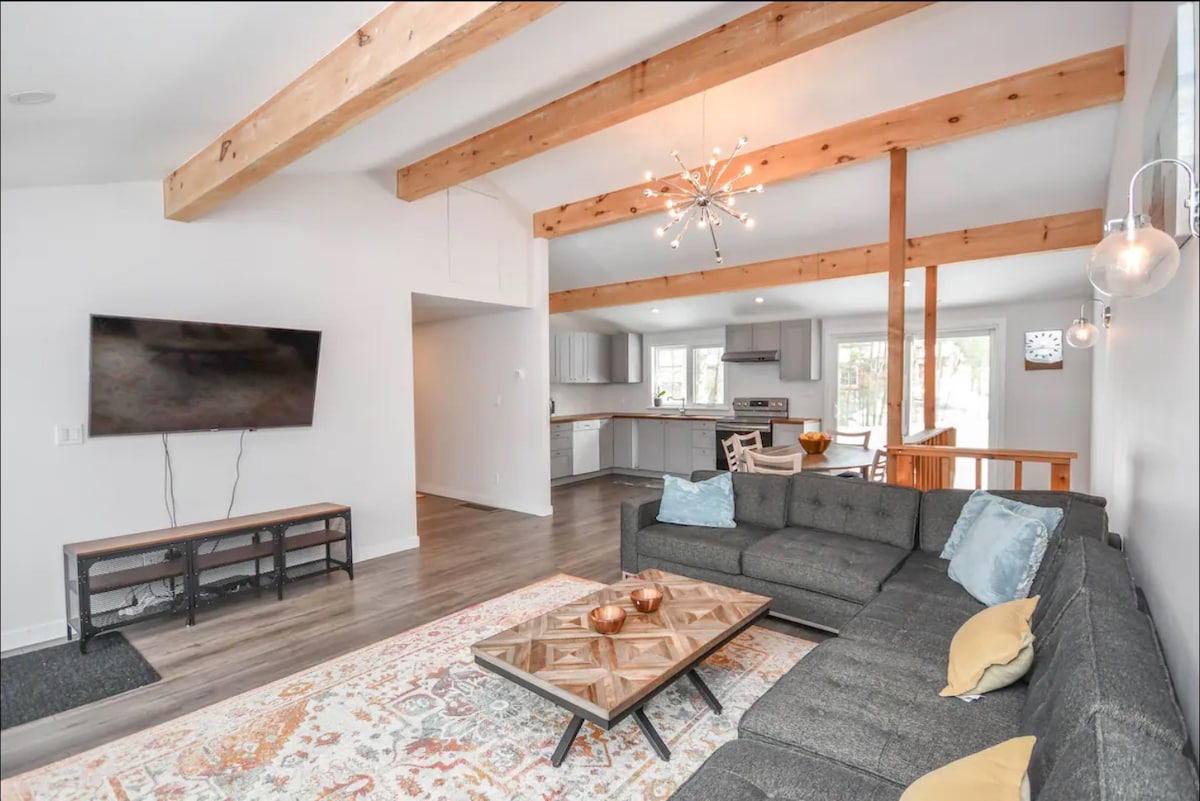 PROČITAJTE! Mt. St. Louis & Horseshoe Valley na pragu! Ovo je svijetli, veliki i privatni APARTMAN ZA GOSTE (podrumski stan). Masažna kada, terasa, ognjište i skrovita staza u šumi za uživanje u prirodi. Kuhinja je opremljena indukcionom pločom za kuvanje i svim potrebnim, čak i otvaračem za boce vina:) Dnevni boravak/kuhinja/trpezarija otvorenog koncepta sa TV-om i Rokuom. Spavaća soba je umetničko delo: tamno, misteriozno i romantično! Prilagođeni bračni krevet napravljen od istrošenog drveta u ambaru koji je spašen sa naše imovine.