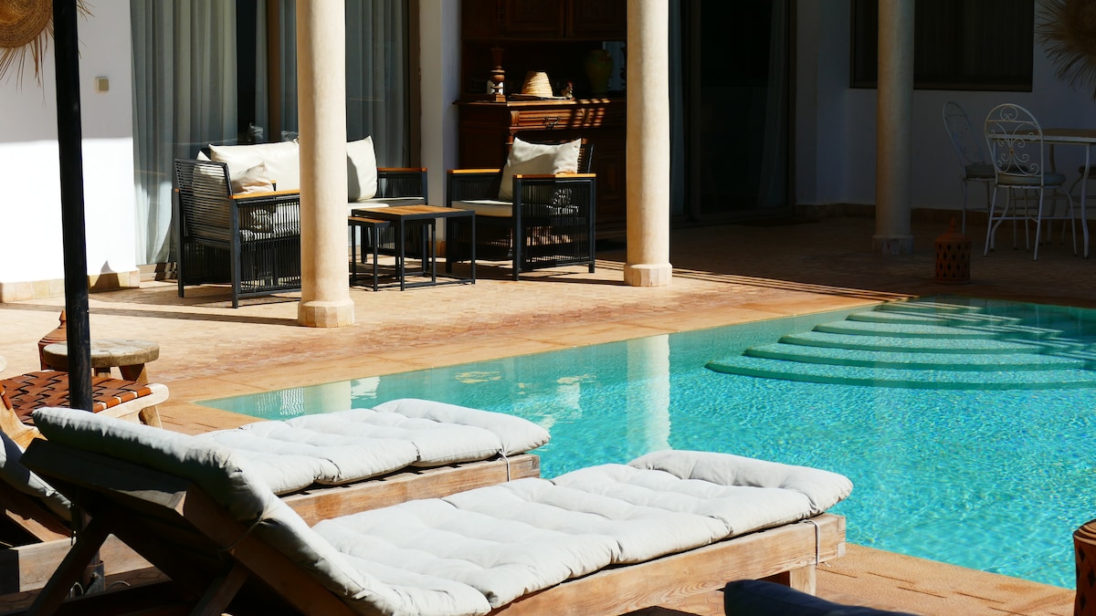 Luksuzna vila nije zanemarena, smeštena na selu 20 minuta od Esauire, poznate po bazenu u stilu plaže koji se grija od novembra do aprila. Nezaboravni zalasci sunca i prilagođen pristup osobama s invaliditetom čine ga izuzetnim mjestom. Otkrijte luksuzan, udoban i stilski uređen prostor. Svijetla dnevna soba nudi savršeno okruženje za opuštanje, sa automatizovanom nadstrešnicom za nesmetan prelazak između unutrašnjeg i spoljašnjeg prostora.