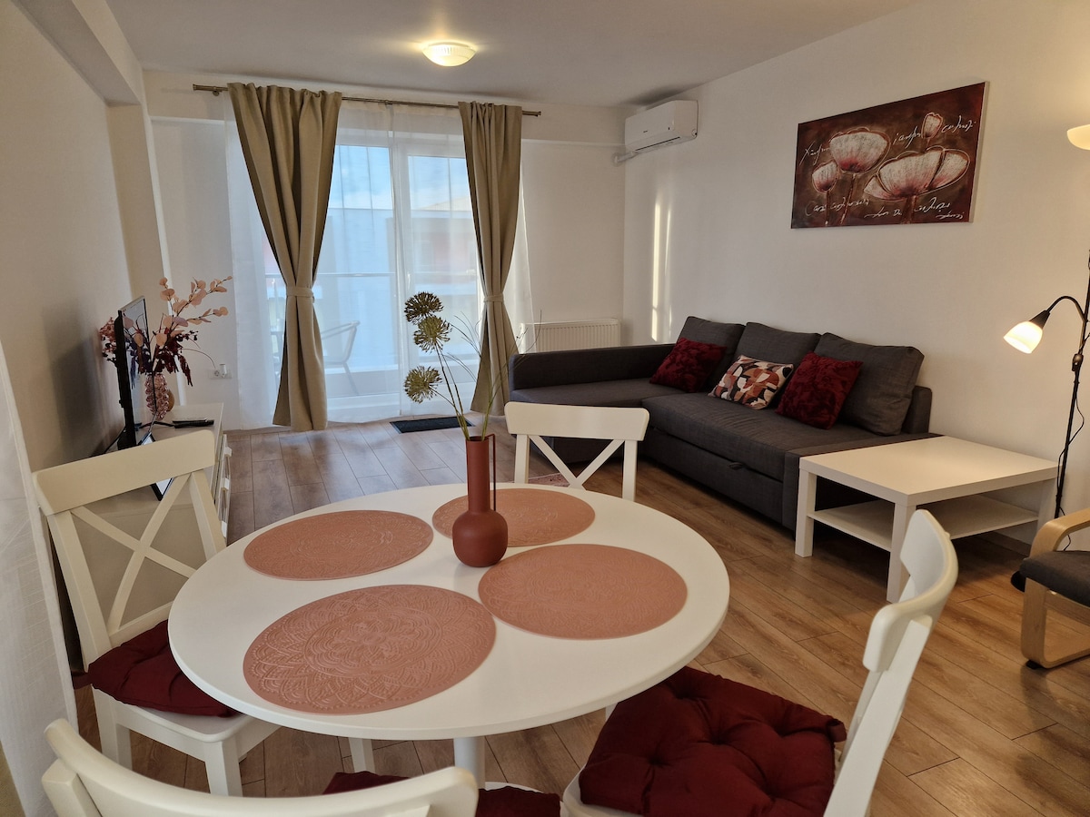 Uživajte u elegantnom doživljaju u centru Otopenija u najnovijem stambenom naselju. Sve nove zgrade, privatni park, vaša privatna bašta na otvorenom i mnoge druge. Smještaj je najsavremeniji studio, dizajner napravljen od jedinstvenih komada namještaja koji se ističu od svih drugih smještaja. To je savršen izbor ako želite da posjetite: Terme Spa, olimpijski bazen, aerodrom itd. Takođe vrlo blizu autobuske stanice koja ide direktno u srce Bukurešta u „Stari grad”