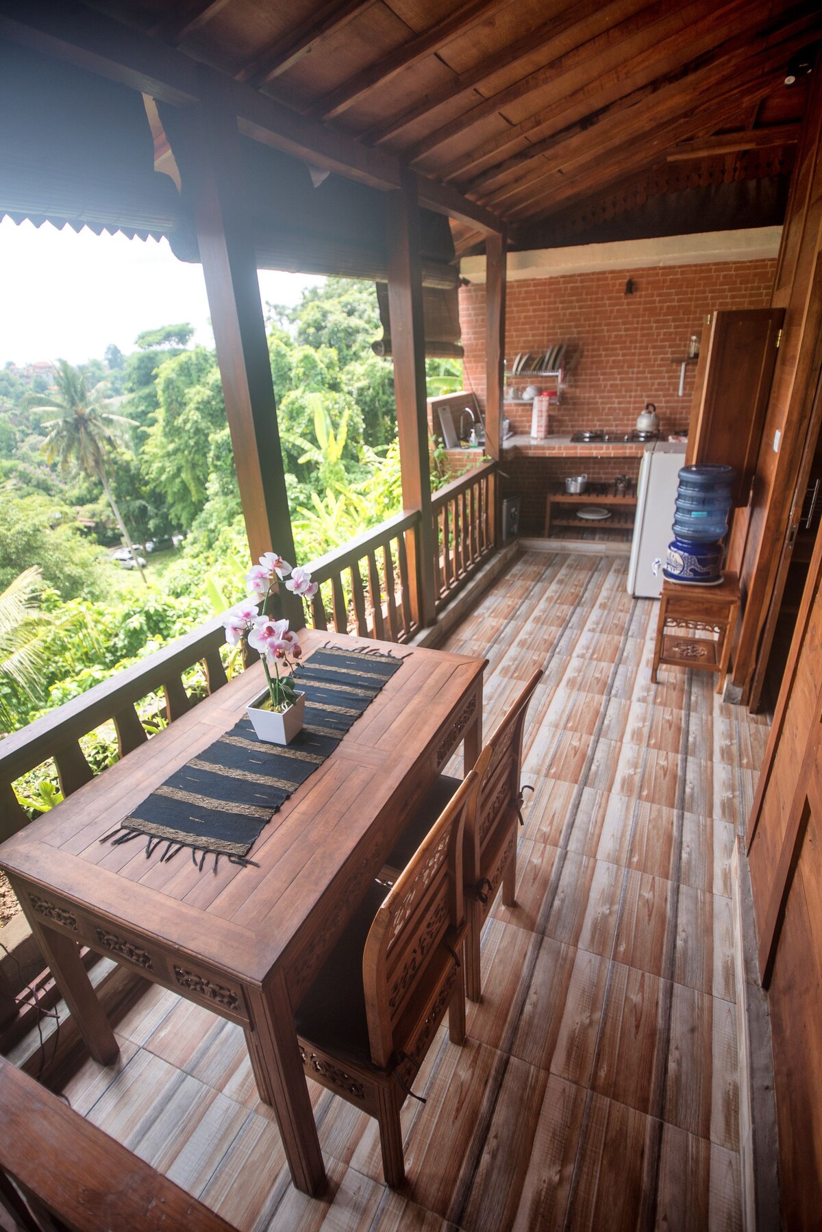 Jedinstveni predlog za Ubud: vila se nalazi samo 1 km od svjetski poznate šume majmuna i glavnog evropskog supermarketa u Ubudu „Coco”; dostupna pješke za 10 minuta od centra Ubuda, ali istovremeno na ivici prostranog polja pirinča; odgovara evropskim standardima smještaja, ali istovremeno napravljenim od drveta i u odnosu na balijsku arhitektonsku tradiciju; sa ogromnim panoramskim prozorima; kupatilo sa modernom kadom. Novoizgrađeno! Besplatan dodatak - skuter sa kacigama.