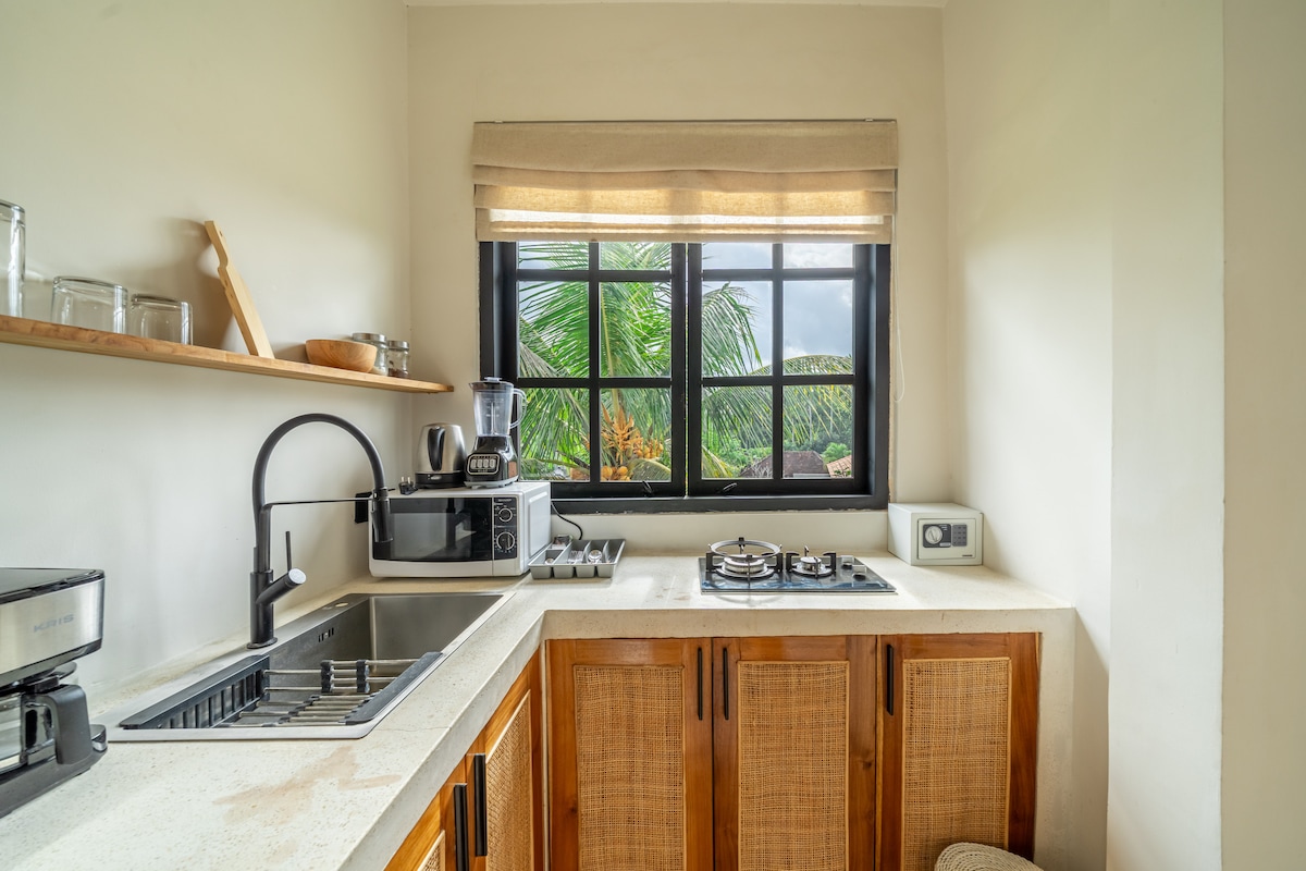 This spacious private suite in Ubud offers a a peaceful retreat and independent stay with a cozy bedroom, full kitchen, and separate living area. Ideal for couples, solo travelers, and digital nomads who value privacy, space, and a peaceful environment. Enjoy calming green views, a relaxed atmosphere, and access to a shared swimming pool within a quiet residential complex. With fully private guest areas, the suite is well suited for short stays, long stays, and remote work while exploring Ubud.