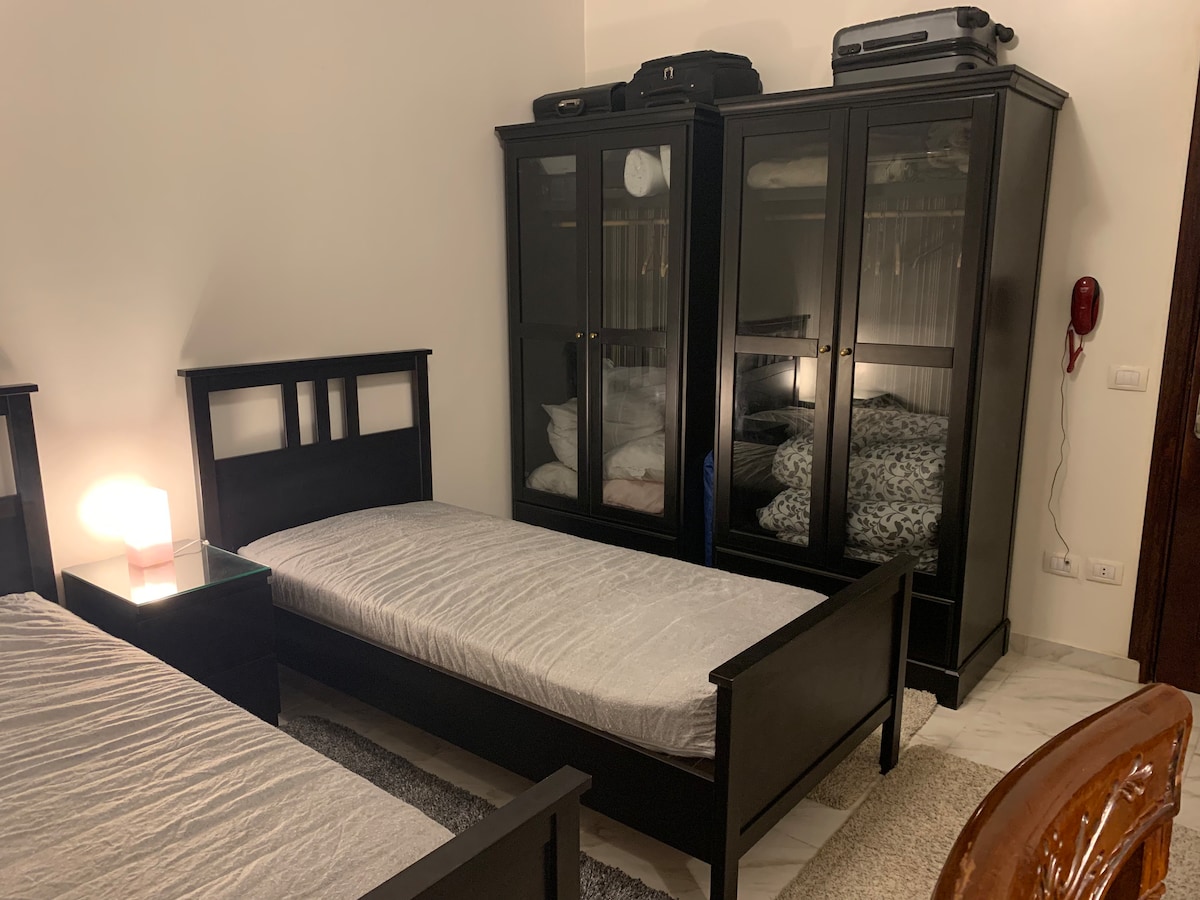 Naše mesto je blizu američke škole u Maadiju, zelenom predgrađu Kaira, koje je mnogo mirnije od centra grada. Možete da pristupite prodavnicama i restoranima peške ili bilo kojim drugim mestom udaljenim taksijem ili Uberom. Svideće vam se naš smeštaj na poslednjem spratu naše zgrade. Ispred sobe možete uživati u velikoj, privatnoj terasi s koje se možete diviti crvenim zalascima sunca iznad krovova nakon cjelodnevnog obilaska Kaira. Naš smeštaj je dobar za solo avanturiste i poslovne putnike.