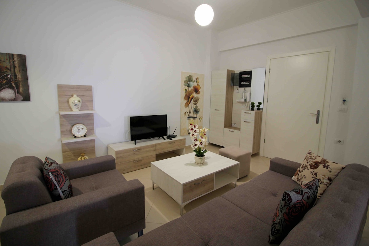 Naš prostrani stan udaljen je samo 5 minuta hoda od plaža, restorana, prodavnica i noćnog života u Sarandi. Nalazi se u centru grada i savršena je baza za istraživanje albanske rivijere. Prostor uključuje potpuno opremljenu kuhinju, brzi Wi-Fi, TV ravnog ekrana, klima-uređaj, mašinu za pranje veša i još mnogo toga. Sve što vam treba za udoban i praktičan boravak. Uživajte na privatnom balkonu s pogledom na more – savršenom mjestu za jutarnju kafu ili opuštajući zalazak sunca. Autobuska stanica je udaljena dva minuta.