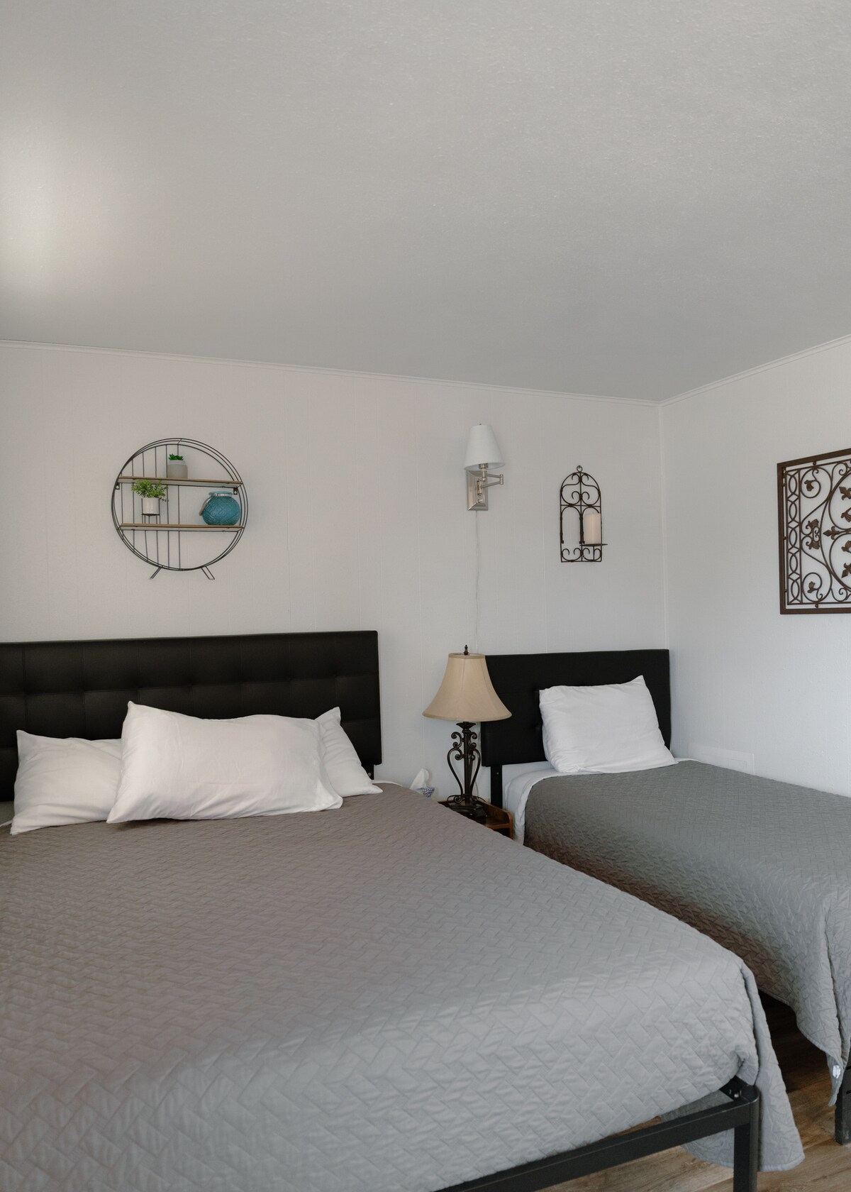 Recently renovated and perfect for solo travelers or couples. It features one queen bed, a small desk for work or planning, and a TV for unwinding after a long day. Additional conveniences include a mini fridge, a coffee station, and a clean, updated bathroom. The large window adds natural light, and an extra blanket ensures your stay is cozy and comfortable. A great choice for anyone seeking a refreshed and functional space.