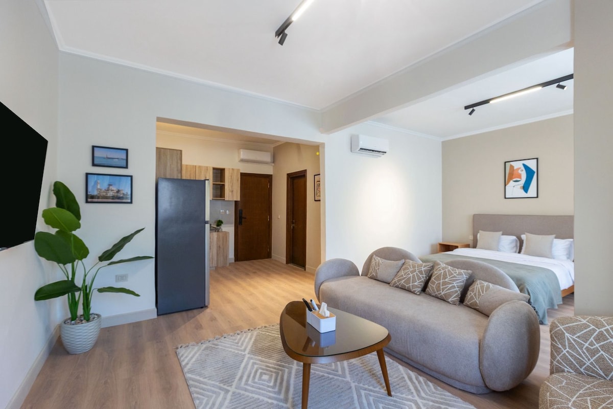 Uživajte u luksuznom boravku u srcu Aleksandrije u ovom modernom jednosobnom stanu s pogledom na more u Saba-paši, jednoj od najelegantnijih gradskih četvrti ✔ Predivan pogled na more ✔ Potpuno novo namješteno sa modernim modernim dekorom ✔ Udoban bračni krevet + udoban prostor za sjedenje ✔ Brzi Wi-Fi i Smart TV ✔ Potpuno opremljena kuhinja ✔ Klima-uređaj za vašu udobnost Potpuno novi kućni aparati inamještaj Savršeno za porodične, poslovne putnike ili goste koji putuju sami i žele udobnost, stil i pogled koji oduzima dah.