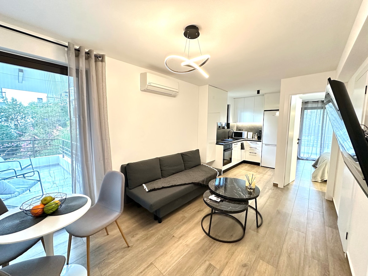 Oпустите се у овом мирном, модерном простору. Савршено за парове или парове са деtetom (доступни су креветац/оградица за бебе и кадица). Кауч се отвара у помоћни лежај. Кревет може вити отворен или затворен на зиду, како велики дневни боравак. Смештен на ивици са Глифадом, удаљен је 7 минута хода до чувеног модног кварта и само 4 минута хода до трамваја који вози до Пиреја, Акропоља, Синтагме, аеродрома. Шетња до многих плажа, ресторана, супермаркета, филмова. Добродошли и уживајте!