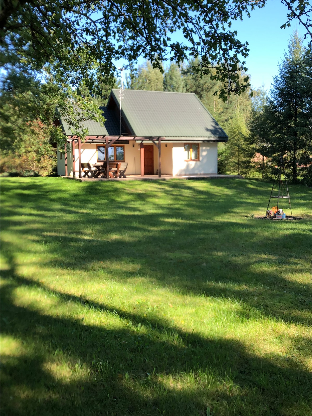 Predivna brvnara izgrađena na glavnom ulazu u Nacionalni park Kampinos, okružena dinama, šumama, livadama i poplavama. Iz seoske kuće možete da čujete prelepe ptice kako pevaju i zvukove divljih životinja. Pristup asfaltnom putu, prelepa bašta je takođe osvetljena noću. Seoska kuća je deo male farme sa organskim usevima jagoda. Tokom vrhunca sezone volimo da im služimo. Smještaj je namijenjen za iznajmljivanje seoske kućice sa ekskluzivnom terasom, a bašta i prostor za rekreaciju su zajednički.