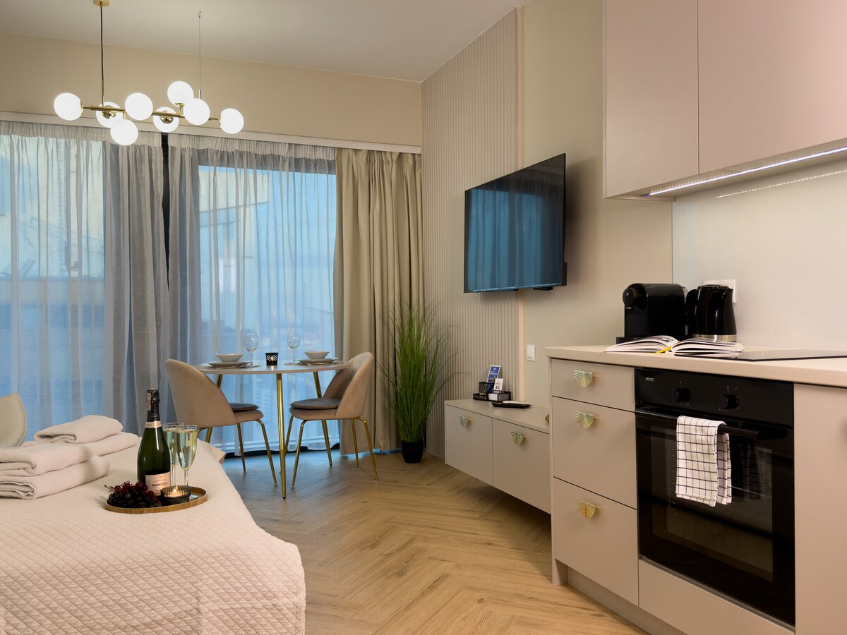 Stan Ceglany(31m²) - moderan stil i pun udobnosti! Pristupačna terasa, svijetli enterijeri sa spoljnim roletnama i mrežama za komarce pružaju savršene uslove za opuštanje. U stanu se nalaze krevet 160x200 i kauč na razvlačenje, potpuno opremljena kuhinja (aparat za kafu, mašina za sudove, čajnik, frižider, mikrotalasna pećnica) i privatno kupatilo sa tušem. Soba ima i peglu, dasku za peglanje i fen za kosu. U zajedničkom prostoru: mašina za pranje veša i mašina za sušenje veša. Nadgledan parking sa ogradom