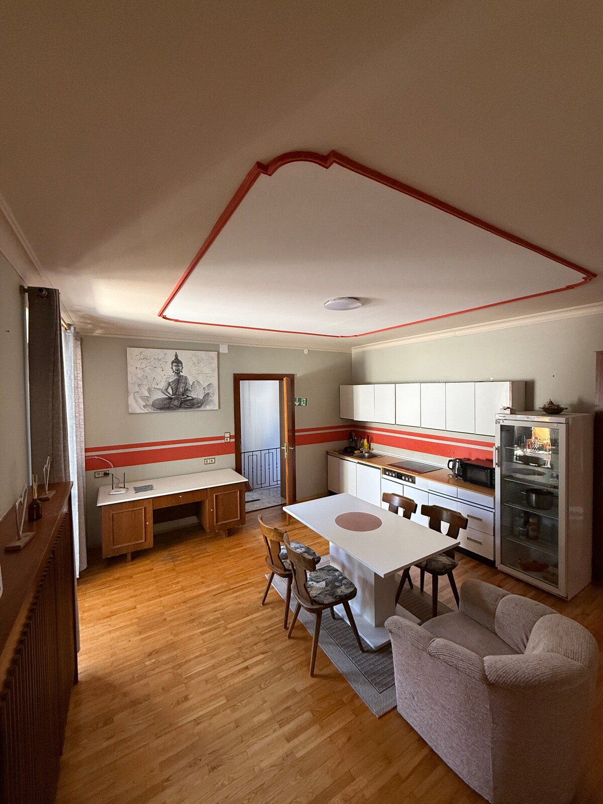 Mjesto gdje se možete opustiti uz buku potoka i cvrkut ptica. Automobil se može parkirati odmah pored naše garaže, a poseban ulaz vodi do udobnog dnevnog boravka sa izloženom krovnom stolicom. U sobi se nalazi TV kutak sa sofom na razvlačenje, trpezarija za 4 osobe i potpuno opremljen sto za stoni fudbal. Vrata balkona od poda do plafona donose dovoljno svjetla u prostore i živopisni sundowner balkon na samoj obali Radaubaha.