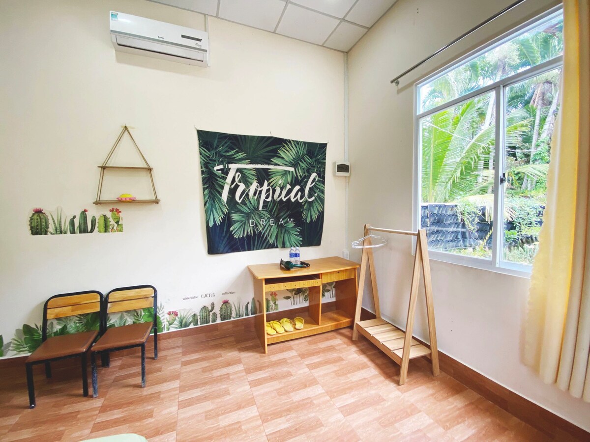 🌿 Privatna dvoetažna brvnara na mirnoj farmi kokosa 🌿 Pobjegnite u svoju dvospratnu brvnaru okruženu prirodom u ruralnom dijelu četvrti B ¥ n Tre. Sa pogledom na baštu, privatnim kupatilom, klima-uređajem na oba sprata i prostorom za grupe ili porodice, savršen je za one koji traže miran, autentičan doživljaj Mekonga. Uživajte u besplatnim kokosima, tropskom voću i besplatnoj biciklističkoj turi kroz selo.