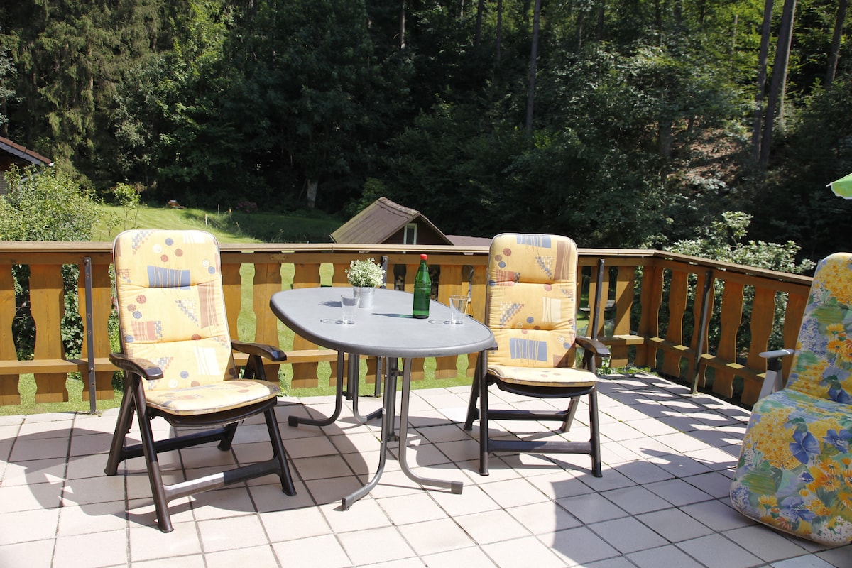 Naša kuća se nalazi u idiličnoj Ajkelbahtal dolini okruženoj šumom. Na prvom spratu se nalazi jednosoban stan (oko 35 m2) sa velikim balkonom sa balkonskim nameštajem za opuštanje. Apartman je predviđen za dve osobe i ima bračni krevet. Može primiti dodatni krevet ili, po želji, dječji krevetić. Na raspolaganju su čajna kuhinja i prostor za sedenje kako biste se osećali prijatno nakon putovanja u predivnom okruženju.