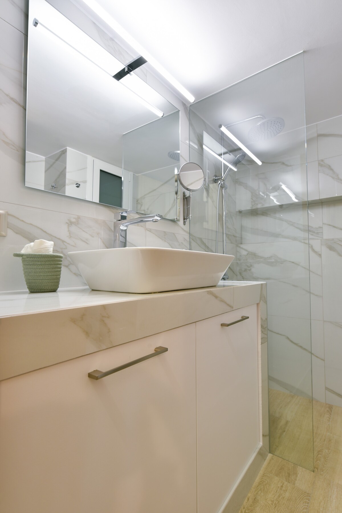 Zakoračite unutra i otkrijte prostran i pažljivo uređen životni prostor koji bez napora kombinuje modernu estetiku sa udobnošću. Dnevni boravak vas dočekuje sa zelenom sofom, savršenom za opuštanje nakon cjelodnevnog istraživanja grada. Susedna trpezarija je idealno mjesto za uživanje u jelima pripremljenim u ogromnoj potpuno opremljenoj kuhinji, sa modernim aparatima i svom osnovnom opremom koja vam je potrebna.