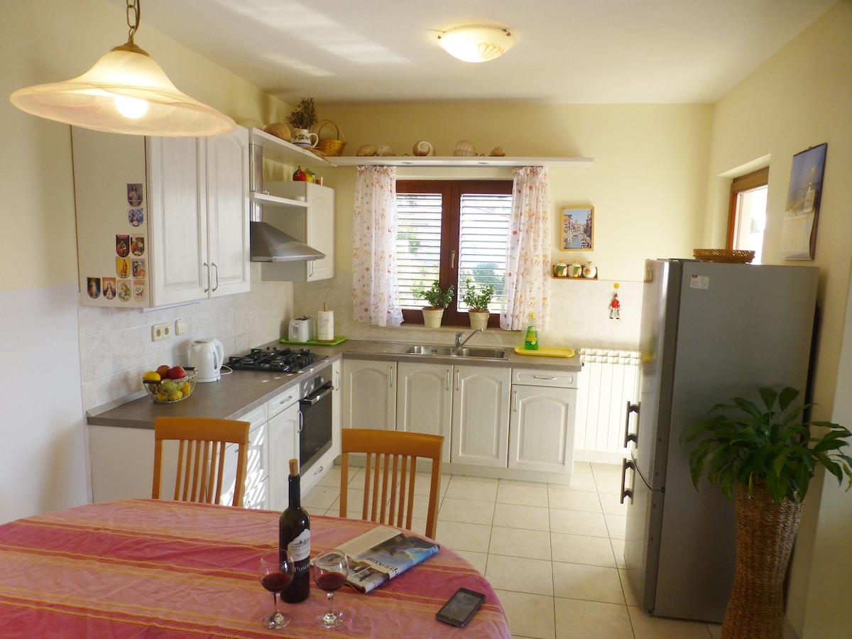 Potpuno novi stan u potkrovlju koji se sastoji od velike kuhinje sa trpezarijom,dvije spavaće sobe, dva kupatila,vešernice i balkona gdje možete uživati u prekrasnom pogledu na more i Paklenska ostrva. Imamo na raspolaganju besplatno parking mjesto ispred kuće. Kuća se nalazi u mirnoj zoni ,ali vrlo blizu svih sadržaja. Centar je udaljen samo 10 minuta od kuće i 5 minuta do prve plaže,supermarketa i restorana.