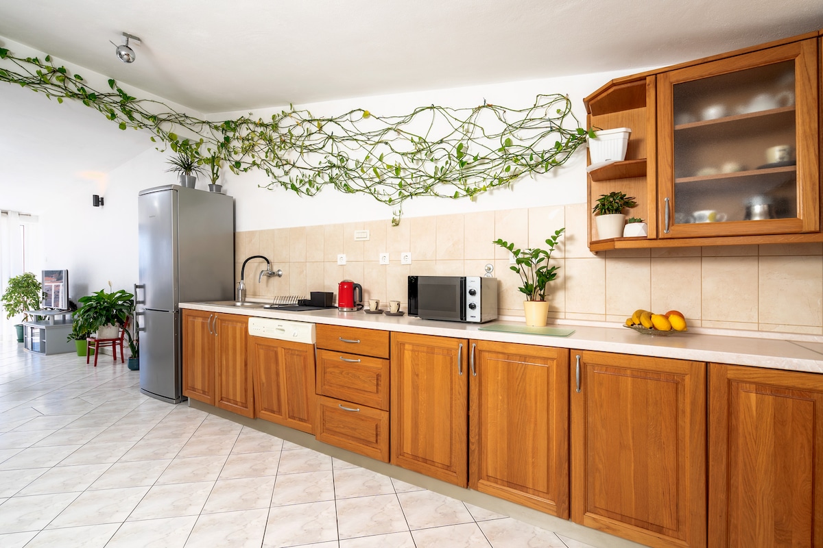 Luksuzni stan sa zadivljujućim pogledom na more Ovaj prelijepi stan se nalazi u mirnom dijelu grada, samo 1500 m od starog centra i oko 350 m od najbliže plaže. Nudi 79 m² stambenog prostora i dvije prostrane terase, od kojih je svaka 25 m². Prednja terasa se može pohvaliti prelijepim pogledom na more, dok natkrivena bočna terasa uključuje opuštajuću hidromasažnu kadu i trpezariju. Obje terase su opremljene stolom i stolicama, savršenim za objedovanje i opuštanje na otvorenom.