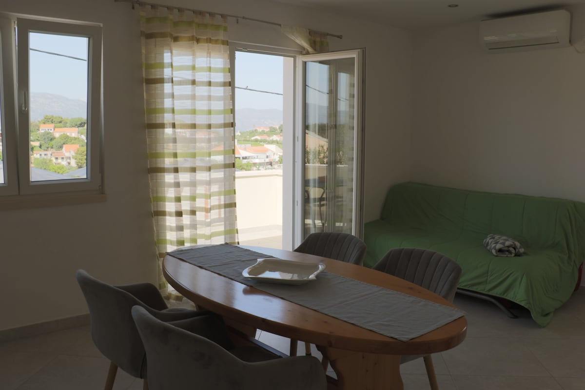 Jednostavan i funkcionalan stan u zelenom dijelu grada Korčule, sa lijepom terasom, okružen predivnom prirodom. Idealno za ljude koji vole da šetaju prirodom. Udaljen je 4 minuta od predivne plaže. Takođe je udaljen 15 minuta od starog centra Korčule. Sva infrastruktura je relativno blizu. Miny market, restoran, dom zdravlja do 300m najbliža plaža 350, 800,1000m itd. 3 megamarketa u raznim pravcima oko 1400m, takođe apoteka.