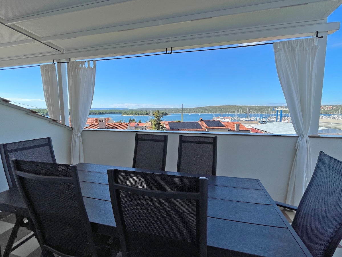 Apartman 1 Ovaj stan se nalazi na prvom spratu kuće i nudi prostor od 45 m2 i veliku terasu od 16 m2 sa prelijepim otvorenim pogledom na more na zaliv sa ostrvom Košljun. Kuća ima 5 stanova i jedan studio apartman. Moj smeštaj se nalazi u blizini porodičnih aktivnosti, aerodroma i centra grada. Cenićete moj smeštaj zbog pogleda, lokacije, grijanog bazena i njegove mediteranske bašte, ljude i atmosferu.