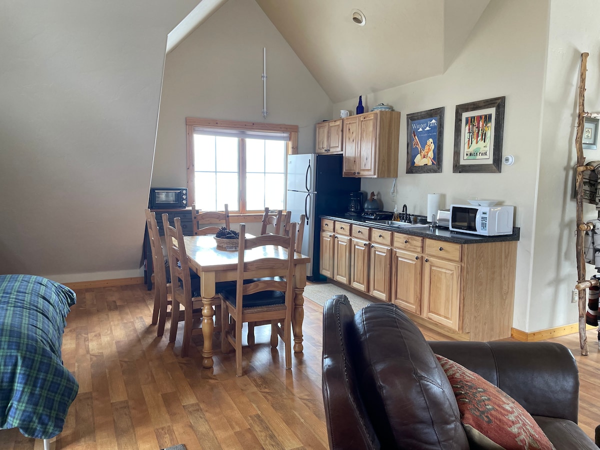 Simpatičan studio apartman sa svime što vam treba. Krevet je krevet na naduvavanje, veoma udoban. Udoban kauč sa otomanom. Čajna kuhinja, kupatilo. Ovaj objekat je veoma jednostavan. U blizini staza i grada Winter Park i Frejzer. Možda čak i vidite divlje životinje! Ostavite svoje brige iza sebe i uđite u zonu! Izađite na suncu, spavajte sa zvijezdama, uvijek stvarajte vatromet!