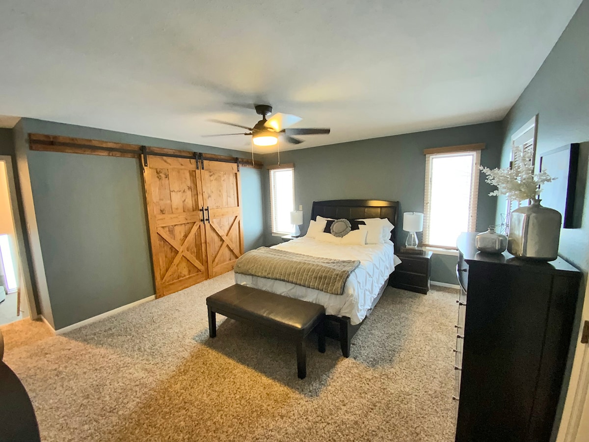 Ovaj jedinstveni smještaj ima sopstveni stil. Dobro došli u naš apartman za goste. Jedna privatna spavaća soba i kupatilo sa otvorenim prostorom sa pogledom na porodičnu garažnu teretanu. Savršeno mesto, bilo da ste u gradu za vikend ili na utakmici za koledž. Napomena: spavaća soba ima svoj termostat za vašu kontrolu. Otvorena garaža u potkrovlju koja se zimi drži oko 65 stepeni, a ljeti na 74 stepena.