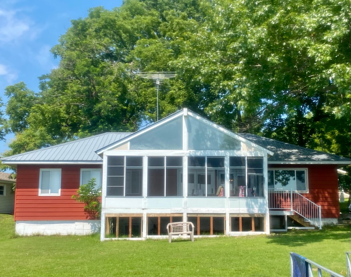 Jezero Front i povoljno smješteno u blizini terena za golf, restorana i iznajmljivanja brodova. veliko privatno pristanište, gdje vas čeka beskrajna zabava. Uživajte u tropskom Tiki baru sa sjedištima za 10 osoba, stereo uređajem, TV-om, frižiderom, mikrotalasnom pećnicom, blenderom i stolom za 6 osoba. Opustite se na udobnim stolicama, pecajte s mola ili izvadite kajake i daske za veslanje na jedan dan na vodi. Odlično za zabavu velikih grupa! Može da primi do 14 osoba.