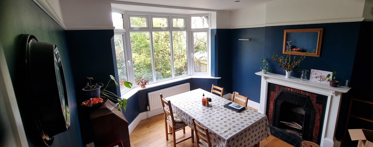 The studio is totally self contained so you can come and go as you please. Very quiet, private and has a South facing balcony overlooking the garden. There is wi-fi, unrestricted parking on the street immediately outside the property. It has a shower. A small dog is welcome to stay and use the garden and there will be £30 charge, payable directly. An oven & microwave are available. It is suitable for 2 adults over 18 years of age.