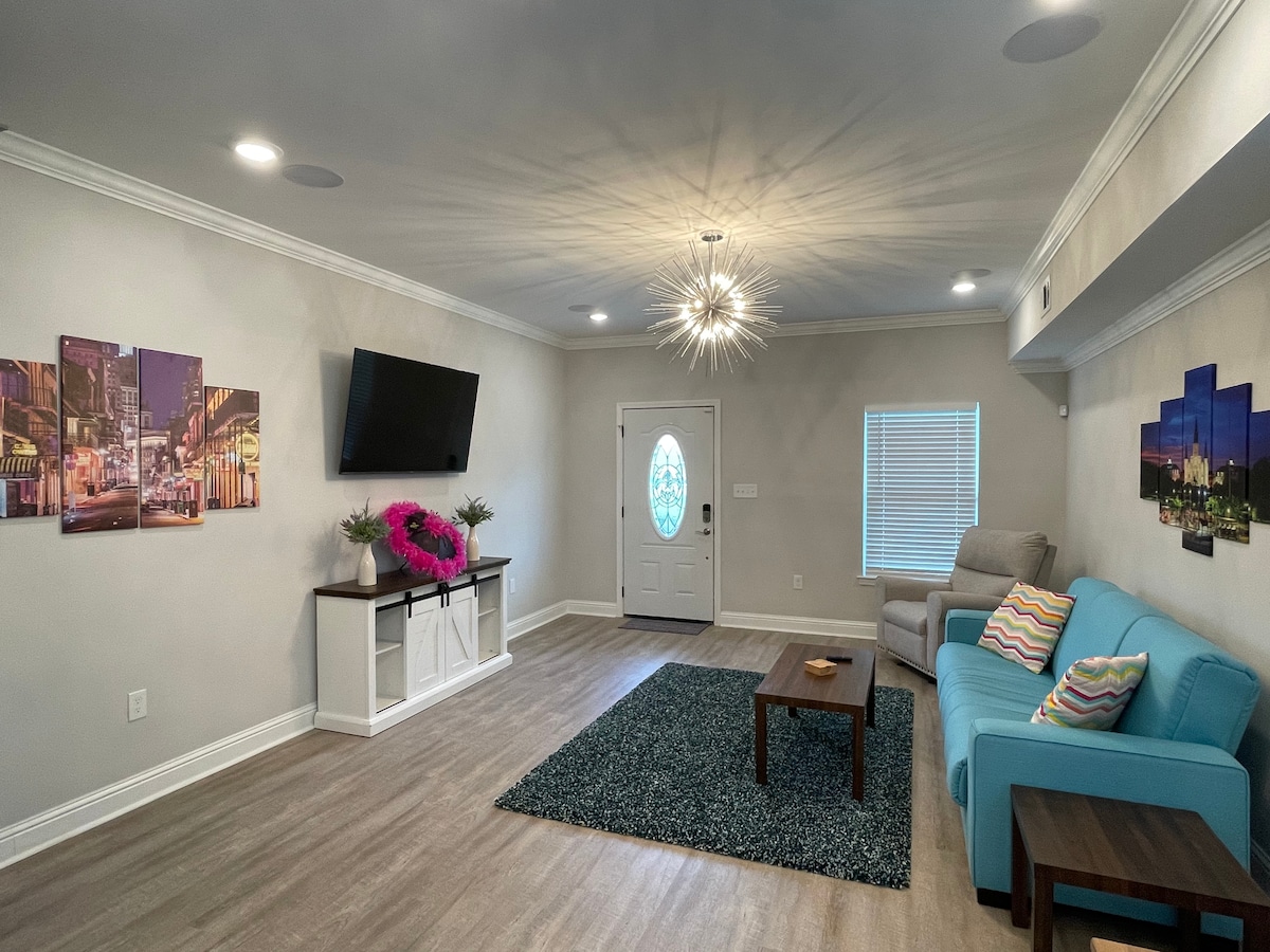 Upravo renoviran, čist i svetao, sa kupatilom za svaku spavaću sobu! Uživajte u velikom dvorištu sa automatskim svetlosnim sistemom noću za opuštanje. Radna stanica sa trostrukim monitorom sa tastaturom i mišem ako treba da se pokrenete na putu - samo ponesite laptop i čvorište. 65" 4k TV za nadoknadu na Netflix-u sa Super Nintendo! Parking na ulici. Potpuno opremljena kuhinja i stanica za kafu za početak dana. Pažljiv vlasnik koji zahtijeva da gosti uživaju u boravku u Nju Orleansu :)