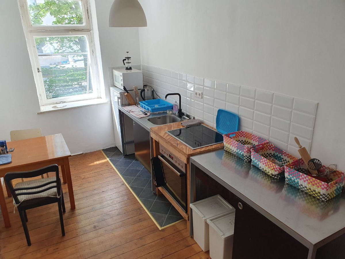 Budite naši gosti! Nudimo smeštaj za 5 osoba u zasebnom stanu u istorijskoj vili sa velikom terasom i baštom. Lokacija se nalazi u centru grada u okrugu Lindenau i dobro je povezana sa javnim prevozom. Na ulici vodimo malu vinariju. Tamo ste dobrodošli kao u našem stanu za goste. Sa zadovoljstvom ćemo vam dati savete i savete o našem gradu uz čašu vina. Radujemo se vašem skorom dolasku!