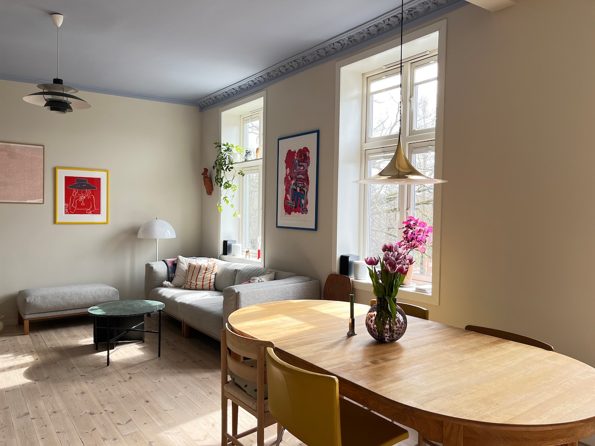 Central to trendy GRÜNERLØKKA - Bright corner apartment with Scandinavian design furniture, spacious master bedroom, and a smaller one with a view to Oslo's most popular park, Sofienbergsparken. Faktor su prozori visoki 3 metra, privatni balkon okrenut prema jugu, zajednička tiha krovna terasa na 8. spratu s panoramskim pogledom na Oslo i supermarket u podrumu. Nalazi se u mirnoj ulici sa 5 minuta kroz park do restorana i prodavnica. Prošetajte ili idite tramvajem do jezera, saune ili podzemne željeznice do alpskih, sanjkališta i skijaških staza.