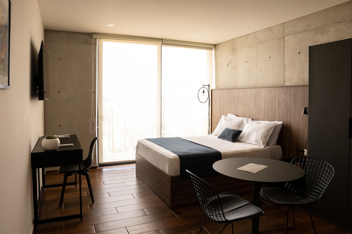- Acogedor y exclusivo estudio ejecutivo con cama queen-size, escritorio y aire acondicionado. - Balcón para tomar aire fresco. - Cocina equipada. - Ingreso con cerradura inteligente y clave personalizada y exclusiva para cada huésped. - Rooftop panorámico con restaurante en el nivel 9. - Sala de juntas equipada para reuniones profesionales (consultar disponibilidad). - Acceso 24/7 con código personalizado. IMPORTANTE: No contamos con estacionamiento privado dentro de la propiedad.