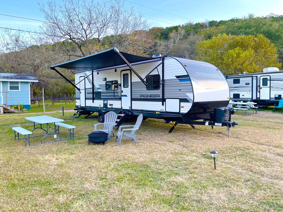 Ovaj kamper od 40 stopa nalazi se u prirodnom okruženju na vrhu brda u blizini reke Gvadalupe, što je čini savršenim mestom za glampovanje. Ima avanturistički osećaj bekstva od svega, ali sa svim udobnostima doma. Sve u krugu od 1 milje od istorijskog centra Gruenea i 3 milje do vodenog parka Schlitterbahn i centra Nju Braunfelsa. Paket uključuje korišćenje cevi i kajaka. Dozvola za REČ u okrugu Comal #L1494