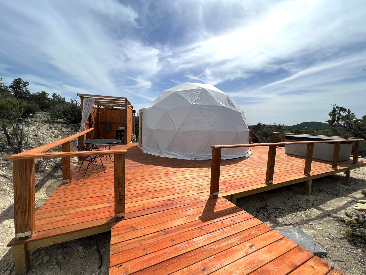 Dođite i uživajte u veličanstvenom pogledu dok uživate u glampovanju u brdovitoj zemlji Teksasa! The Hill Country Dome is set on 11 acres of peace, quiet, and privacy. Uživajte u prostranoj terasi sa hidromasažnom kadom, stolom i stolicama i roštiljem. Samo nekoliko koraka dalje uživajte u zalasku sunca na sopstvenoj privatnoj vatri