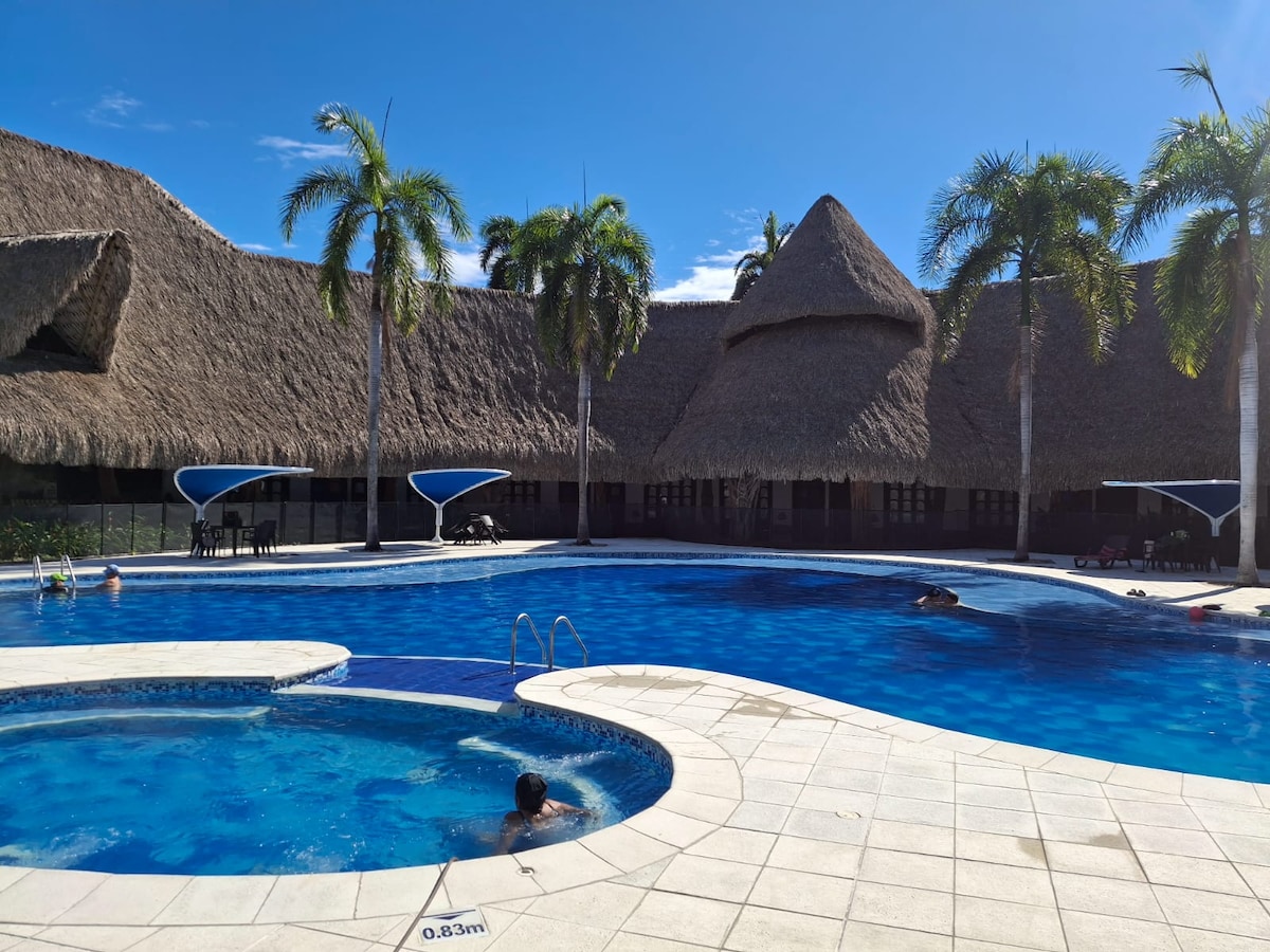 Spektakularni apartman Nuevo potpuno namješten Idealno za opuštanje ima tri spavaće sobe, udobne krevete, plafonski ormar sa ventilatorom u svakoj sobi. Dva kupatila (peškiri za ruke, toalet papir i sapun za ruke) Vrlo opremljena kuhinja, frižider, prostor za pranje veša, TV soba od 55 inča, zvučni bar, društvene igre, američki bar sa dvije stolice, balkon ima, sto i dvije stolice, a prostor za druženje ima bazen , đakuzi, teniski teren, Kiosko, parking