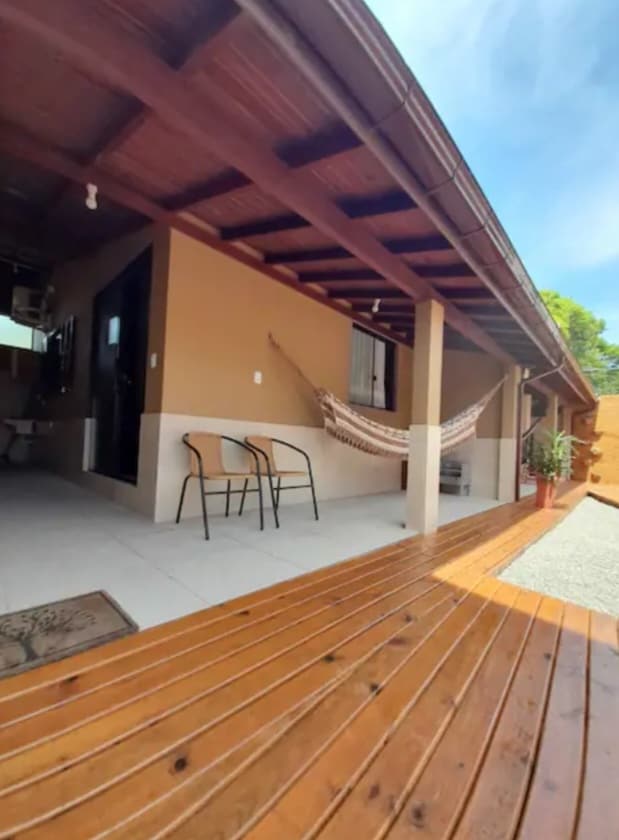 Mala kuća na pijesku koja se nalazi na granici plaže Guarda do Embaú! U blizini centra i svih dobrih stvari ovdje: plaže, staze, obala, more, rijeka, brodovi, surfovanje, kitovi (sezona od jula do novembra). I trgovina sa prodavnicama, barovima, kafićima, restoranima, pijacom... Samo dođite i uživajte u svemu pješke! Kuća je podijeljena na tri dijela, ali se samo dvije koriste za iznajmljivanje. Pristupna kapija je ista za sve, bašta je zajednički prostor i svaka kuća ima svoj privatni balkon.