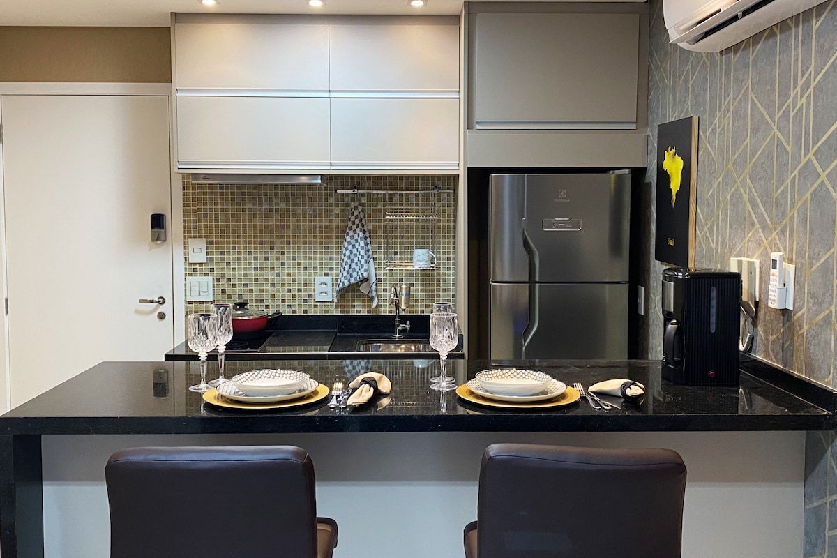 Savršen smještaj za one koji traže udobnost, bezbjednost, jednostavan pristup aerodromu GRU (9 km) i najbolju lokaciju u gradu. Ima: - Bračni krevet (širine 150-179 cm) -tv smart -izvorni kondicion(topli/hladni) -wi-fi Kancelarija - testera -sofa-krevet -cortina black-out -varanda -cozinha equipada - Krevet/kupatila Kompletna infrastruktura u kondominijumu Bazen na krovu (u izgradnji od 9. marta do 18. aprila 2026. godine) sa najljepšim pogledom na grad. Ima ograđeno/natkriveno parking mjesto. Ne primamo kućne ljubimce.