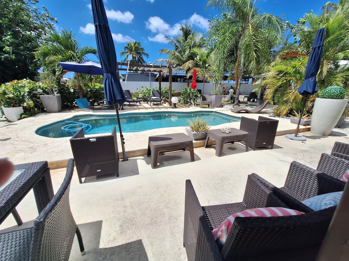 Dobro došli u Zapadni Portoriko! Uđite u ogromnu sjajnu sobu sa plafonima od 20 stopa i 3.000 kvadratnih stopa. Sa BAZENOM pune veličine, spoljnim prostorom za roštilj i salon, kompletnom kuhinjom i prostorom za zabavu sa 65-inčnim pametnim televizorom, neće vas razočarati! Kuća ima dovoljno klima-uređaja i rezervni generator/vodu. Na centralnoj lokaciji! 10 minuta - plaže/restorani u Aguadi 20 min - centar Rinkona/plaže 25 min - Aguadilla Downtown i poznata plaža Crashboat! 25 minuta - aerodrom BQN 2,5 sata - aerodrom Sju
