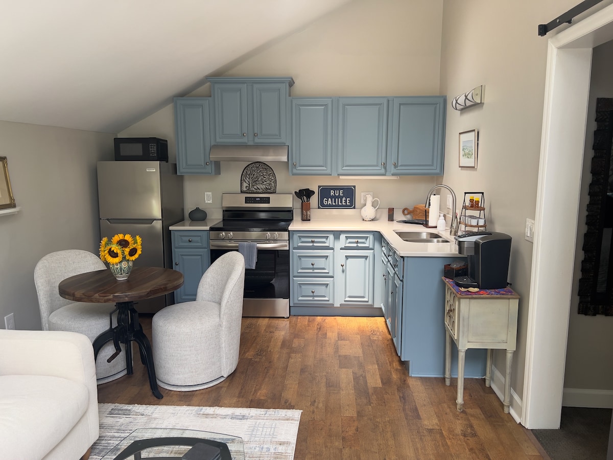 Dobrodošli u Tranquility, studio apartman sa stanom za punjenje električnih vozila Tesla. Naš udoban (savršen za 1-2 gosta), ~300 kvadratnih stopa, dobro opremljen studio apartman nalazi se iznad odvojene garaže (sa ultra tihim otvaračem za garažu) sa zasebnim ulazom na istom imanju kao i naša porodična kuća u Old Irving Parku u Grinsborou. Uživajte u potpunoj privatnosti u sigurnom, mirnom i šumovitom okruženju, a ipak budite u blizini restorana i kupovine. Dovoljno mjesta za parkiranje na prilazu ili na ulici. I mi smo ljubazni prema kućnim ljubimcima!