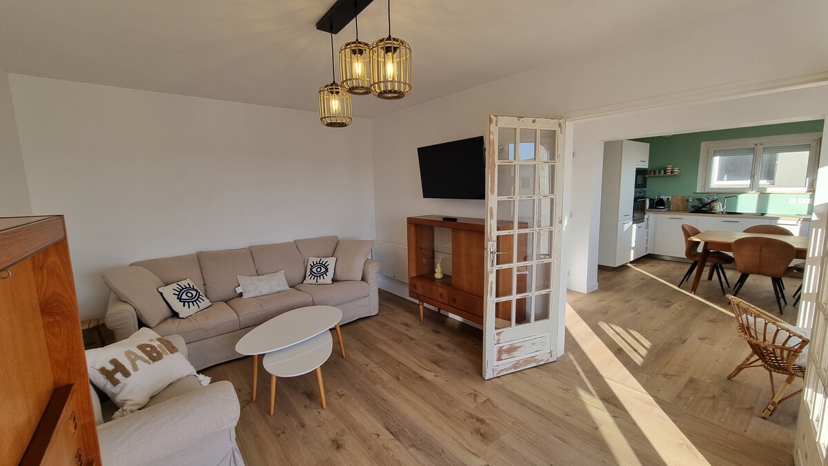 Loue maison toute équipée sur 2 niveaux. Rénovée en 2025. Vue mer, donnant sur la plage. Capacité de 6 personnes : La maison comprend 3 chambres , dont une suite parentale avec baignoire, et une salle d'eau avec douche indépendante. Les chambres sont munies de lits de 160 x 200 et la 3éme avec lit de 90 x 200. Cuisine équipée, avec salon t.v. Animaux acceptés. Wi-Fi. propriétaire au RDC. totale indépendance.