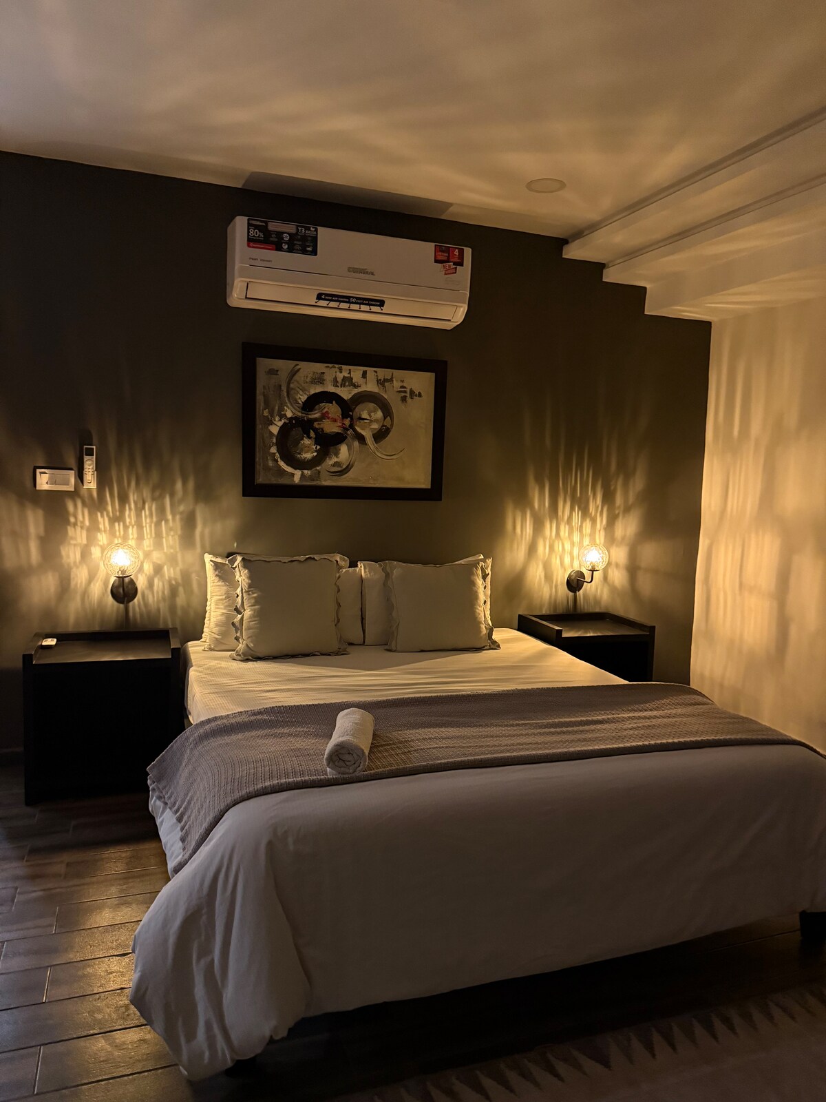 ✨ Moderan i udoban smještaj ✨ Uživajte u elegantnom smještaju sa bračnim krevetom, elegantnim dekorom i toplim osvjetljenjem. Veliki prozori pružaju prelijep pogled, dok je udoban prostor za sjedenje savršen za opuštanje. ✅ Ključne karakteristike: Moderan, svijetao enterijer Klima-uređaj Mirna i privatna lokacija 📍 U blizini kafića, prodavnica i atrakcija — idealno za parove ili putnike koji putuju sami.