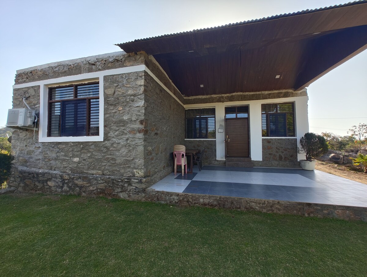 Seoska kuća na litici sa zadivljujućim pogledom na planinu Abu Smještena na litici u brdima Aravalli, naša seoska kuća nudi pogled na planinu Abu koji oduzima dah kroz francuske i klipove prozore. Okružen bujnom prirodom, to je mirno utočište koje spaja rustikalni šarm sa modernom udobnošću. Uživajte u jahanju na slikovitim stazama, uživajte u ukusnim jelima s panoramskim pogledom ili se jednostavno opustite u miru. Naša seoska kuća obećava jedinstven i nezaboravan doživljaj usred ljepote planina.