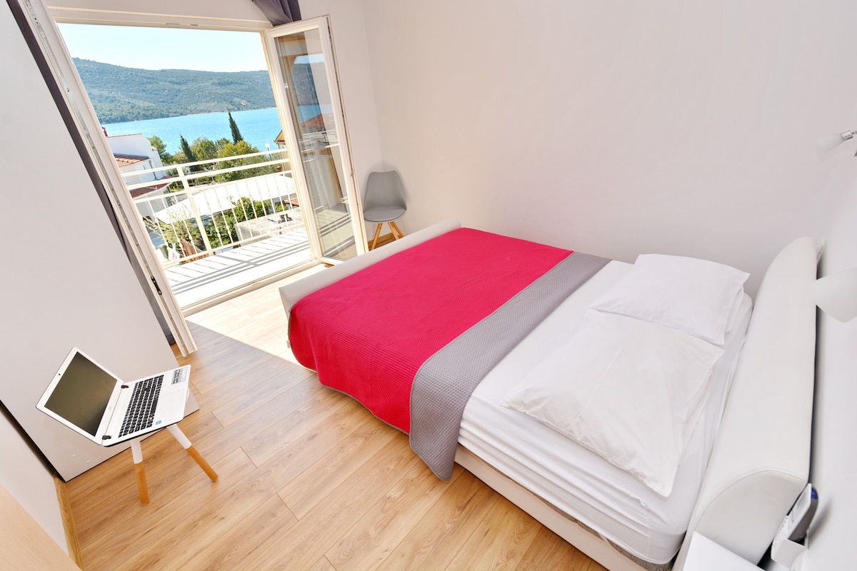 Potpuno renoviran trosoban stan, veličanstven pogled na more iz svakog ugla vile, pun sunčeve svetlosti, miran, moderan, ali sa šarmom rustikalnih mediteranskih vila, veoma prostran, okružen velikim vrtom sa borovima, smokvama, ruzmarinom…. Idealno polazište za istraživanje obližnjih gradova Trogira (6 km), Splita (35 km). Objekat je u potpunosti ograđen, dva besplatna parking mesta. Svi su dobrodošli!